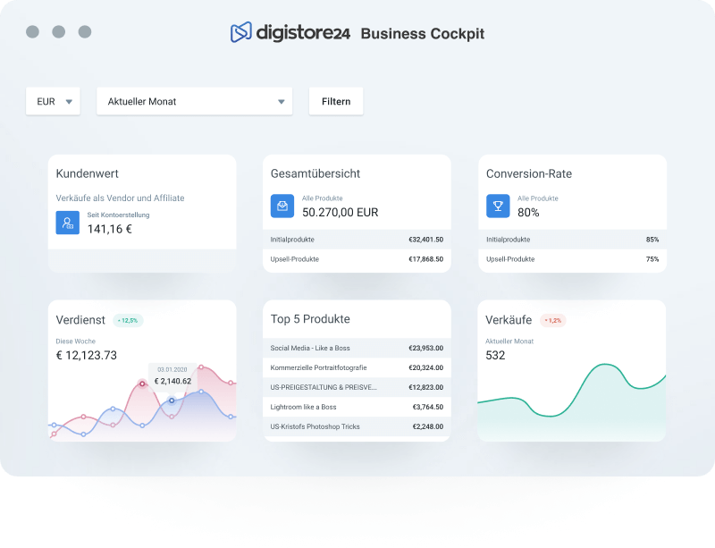 Grow your business by identifying trends through real time data in the Business Cockpit and getting applicable insights in Digistore24 Analytics.
